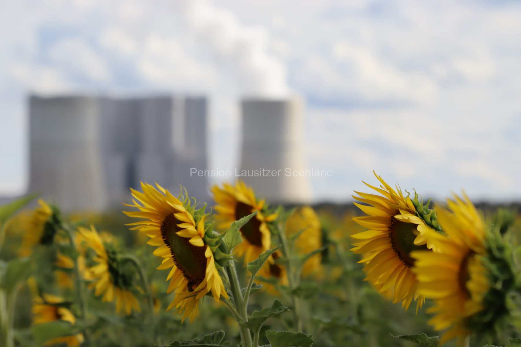 Sonnenblumenfeld mit Kraftwerk Schwarze Pumpe